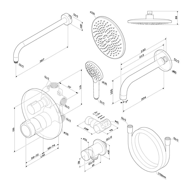 Размер ручного душа - 120 мм. Длина душевого шланга - 1750 мм. Размер держателя лейки ручного душа (Ш/Г/В): 80x204x105 мм. Цвет - хром. Монтируемый в стену излив - это современное решение для экономии пространства. Длина излива составляет 204 мм. Цвет - хром. Размер смесителя (Ш/Г/В): 150x144x180 мм. Материал встраиваемой душевой системы - Латунь, Zamak, нержавеющая сталь, PPA.